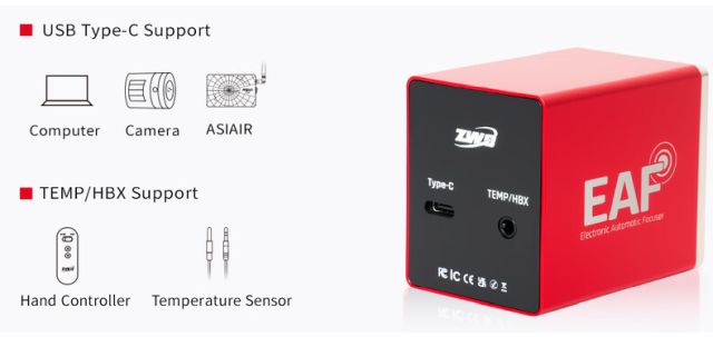 ZWO EAF 5V(Electronic Automatic Focuser) elektronický zaostřovač PV (pokročilá verze s ručkou a senzorem teploty). Nejnovější inovace od ZWO s napájením 5V přes USB-C. Tento elektronický zaostřovací modul umožňuje přesné a dynamické ovládání ostření pro planetární a deep-sky snímky a při pozorování. Při objednávce je nutné zvolit variantu.
